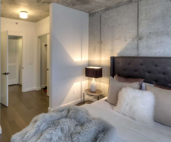 The building has a plethora of thoughtful features, but so do the apartments, themselves. The modern kitchens are accented with blackened steel backsplashes and the floor to ceiling windows offer expansive views of the city skyline as well as Lake Michigan. Hardwood floors are featured throughout, to which the exposed concrete ceilings add an industrial contrast.